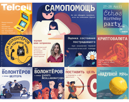 As a graphic and visual communication designer in Ethos Charity Foundation, I’ve created numerous sets of cards for Instagram and Telegram (as well as Boosty and Patreon banners and printed posters) to inform about the foundation activities, festivals and jobs. I was particularly responsible for the psychological aid group announcements and crowdfunding and fundraising methods visuals.